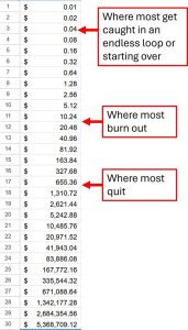 But most people quit or change tactics or pull a squirrel effect with every bright shiny object and they never make it past day two, let alone make it to day 30 of doubling that penny.